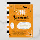 Invitation à une fête d'anniversaire d'Halloween avec Spooktacular écrit dans une combinaison de polices amusantes, les doubles o dans 'spook' conçus pour ressembler à de grands yeux. Le texte est entouré d'étoiles dorées, d'araignées et d'une chauve-souris. Et un fantôme mignon indique à vos invités le nom et l'âge de l'enfant qui fête son anniversaire. Le verso présente des rayures assorties en noir, blanc et orange.