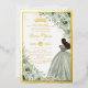 Personnalisez facilement et rapidement cette élégante invitation en feuille d'or pour les 15 ans / Sweet 16 avec des fleurs vert sauge. Cliquez simplement sur le bouton "personnaliser davantage" pour modifier les textes, changer les polices et les couleurs des polices. Caractéristiques : fleurs vert sauge aquarelles douces, une fille habillée d'une belle robe de bal vert sauge et une couronne de princesse dorée. Parfait pour les 15 ans, les 16 ans, les 18 ans, le bal des débutantes et bien d'autres occasions ! Articles assortis disponibles en magasin. (c) Somerset Fine Paperie
