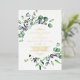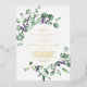 Cette invitation rustique en feuille d'or lavande décontractée mariage est parfaite pour un mariage extérieur simple et élégant. Le design floral présente des feuilles d'eucalyptus aquarelle et de la verdure avec des sprigs de fleurs sauvages violets avec luxueux texte de feuille d'or.