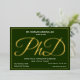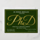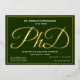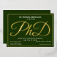 Une invitation à la fête de doctorat avec feuille d'or, texte blanc, et un arrière - plan vert. Ajoutez simplement vos informations, ajoutez cette invitation à votre panier et célébrez cette réalisation majeure. Green Gold PhD Graduation Foil Invitation Conception de vacances | ©Melissa Patton - Designer