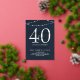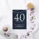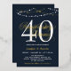 Invitation à une soirée d'anniversaire de mariage de 40 ans en bleu marine avec des détails en feuille d'or et blanc. Invitation d'anniversaire de mariage avec guirlandes lumineuses sans photo avec les années que vous avez passées ensemble en caractères blancs et vos noms en feuille d'or. Invitation élégante pour les quarante ans de mariage personnalisée avec vos noms en feuille d'or sur fond bleu marine.