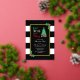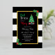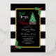 Mangez, buvez et soyez joyeux invitation de fête de Noël avec un arbre de Noël et des cadeaux contre un cadre d'or. Arrière - plan rayé noir et blanc avec saint