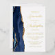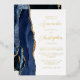 Le bord gauche de cette élégante invitation de mariage moderne présente une bordure d'agate aquarelle bleu nuit ornée de faux paillettes d'or. Le texte personnalisable combine des polices script et sans empattement en véritable feuille d'or sur fond blanc. Le verso présente un design agate assorti.