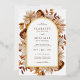 Cette élégante invitation de mariage comprend un cadre en feuille d'or et des feuilles d'orange et de terre cuite peints à la main, des dahlias crème et beige, et de beaux roses couleur rouille sur un arrière - plan blanc. Trouvez les articles correspondants dans la collection White Autumn Romance.