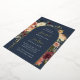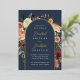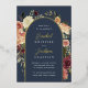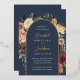D'élégantes invitations à des mariages fleuris ou des mariages d'automne ou d'hiver présentent vos détails encadrés par une arche de roses d'aquarelle, de mamans et de verdure aux couleurs d'automne rustiques, y compris pêche, ivoire, rougissant, bordeaux et vert, avec des garnitures en feuille d'or et des scripts de calligraphie en or sur un arrière - plan bleu marine. Un design moderne et élégant pour des mariages rustiques chic en automne ou en hiver.