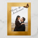 Un plum élégant pourpre avec texte en feuille d'or, cette invitation de mariage est complétée par des dahlias d'automne colorés, des roses, des anémones et des tiges de blé pour créer une invitation saisissante. Le papillon monarque met en valeur le texte en feuille d'or sur le devant et la photo du couple au dos pour un thème de mariage véritablement automnal.