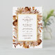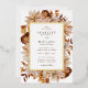 Invitation Mariage de automne Aquarelle Foil. Cette élégante invitation de mariage comprend un cadre en feuille d'or et des feuilles d'orange et de terre cuite peints à la main, des dahlias crème et beige, et de beaux roses couleur rouille sur un arrière - plan blanc. Trouvez les articles correspondants dans la collection White Autumn Romance.