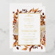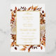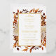 Cette faire-part de mariage élégante et moderne dispose d'un beau cadre d'aquarelle boho peinte à la main, de feuilles orange brûlé et en terre cuite, de dahlias crème et beige, et de beaux roses de couleur rouille sur un arrière - plan blanc imprimé en véritable feuille d'or. Trouvez les articles correspondants dans la collection White Autumn Romance.