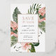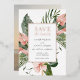 Foil pressé Mariage Enregistrer la Date pour une ambiance tropicale. Doté de fleurs tropicales roses et d'une végétation luxuriante. Inclure votre photo à l'arrière ou supprimer et laisser vide. Éditez avec votre libellé et choisissez parmi trois couleurs de feuille différentes, dont l'or, l'argent et l'or rose.