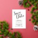 Modern Script Faire-part de mariage Suite : Save the Date Card Ce titre design "Save the Date" en papier or rose véritable police de script moderne avec détails mariages en feuille d'or rose réel police sans serif moderne sur arrière - plan blanc.