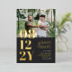 Mariage de typographie élégant enregistrer la date en gris foncé avec votre date mariage dans de grands numéros de feuille d'or sur le côté de sauvegarder la date. Ajoutez les noms et les détails dans la feuille d'or. Papier or et mariage gris foncé enregistrer la date avec la photo.