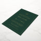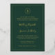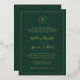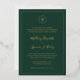 Faire-part de mariage simple en feuille verte et dorée de forêt avec votre monogramme dans un cercle en haut et vos détails mariages entourés d'une mince bordure. Vos noms sont dans une police de caractères manuscrite élégante. Tous les éléments de conception à l'avant sont imprimés en papier véritable. La disposition classique et traditionnelle fait de cette invitation une invitation à un mariage formel.