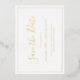 Simple mariage sans photo Enregistrer la carte Date avec "Enregistrer la Date" dans un élégant script manuscrit avec vos détails entourés d'une fine bordure. Tous les éléments de conception sont en feuille d'or. La mise en page classique et traditionnelle sans photos fait de cette carte Save the Date une carte idéale pour un mariage formel.