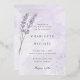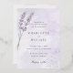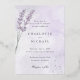 Elégante invitation de mariage, avec des fleurs de lavande aquarelle et un bec de feuille d'argent. Présenté sur un arrière - plan d'aquarelle violet clair.