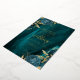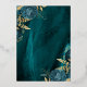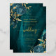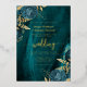Cette invitation de mariage élégante présente des bouquets floraux sarcelle bleue mis en valeur avec une fausse verdure en feuille d'or dans deux coins, sur une image de fond d'aquarelle sarcelle agate. Le texte personnalisable combine de véritables fontes serif, italique et écriture manuscrite en feuille d'or. Le verso présente un design floral et agate sarcelle et or assorti.