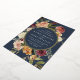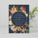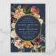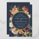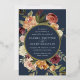 D'élégantes invitations à des mariages fleuris ou des mariages d'automne ou d'hiver vous offrent des détails encerclés de roses d'aquarelle, de mamans et de verdure dans des couleurs d'automne rustiques, comme la pêche, l'ivoire, le rougissement, le bordeaux et le vert, avec des garnitures en feuille d'or sur un riche arrière - plan bleu marine. Un design moderne et élégant pour des mariages rustiques chic en automne ou en hiver.