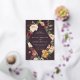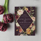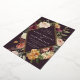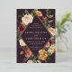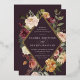 D'élégantes invitations à des mariages fleuris ou des mariages d'automne ou d'hiver présentent vos détails nichés dans un losange allongé entouré de roses d'aquarelle, de mamans et de verdure dans des couleurs d'automne rustiques, comme la pêche, l'ivoire, le rougissement, le bordeaux et le vert sur un riche arrière - plan prune violette. La garniture en feuille d'or complète la conception.