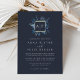 Un élégant faire-part de mariage monogramme avec vos initiales, monogramme ou duogramme en haut, niché dans une couronne carré de feuillage d'aquarelle d'hiver avec garniture en feuille d'or. Un regard moderne et élégant sur la tendance botanique des mariages d'hiver. Colorway : Winter Azure, un mélange de bleus gelés sur un arrière - plan de la marine.