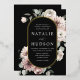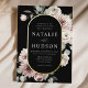 Élégantes invitations de mariage florales hivernales avec vos détails mariages affichés en lettres blanches nichées à l'intérieur d'un cadre floral ovale en feuille d'or avec un arrière - plan noir. Les fleurs d'hiver sont recouvertes d'une palette de couleurs de rose, rose clair, ivoire et jaune doré doux, avec des feuilles d'eucalyptus et des feuillages d'hiver dans des tons vert sauge et vert forêt riche.