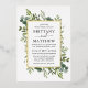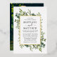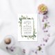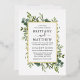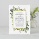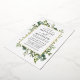 Invitation de mariage élégante et moderne avec feuilles d'eucalyptus et autres verdures botaniques. Cadre en feuille d'or. Dos photo.