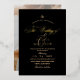 Faire-part de mariage royale moderne et design noir et or avec une police manuscrite élégante avec des boucles et un monogramme de la mariée et du marié. Invitation classique et élégante, simple et moderne.