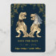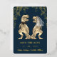 Voici la meilleure façon d'ajouter une touche ludique à votre grand jour. Dinosaur Mariage à thème T-Rex Bride et Groom feuille d'or Enregistrer la date Invitation. Avec des illustrations d'aquarelle vibrantes d'une mariée et mariée charmante T-Rex, cela sauve la date faire-part de mariage est sûr d'apporter des sourires au visage de vos invités. Écriture en feuille d'or et typographie moderne et détails en feuille de feuille d'eucalyptus, combine le plaisir et l'élégance dans un design délicieux sur un arrière - plan bleu marine foncé frappant. Facilement personnalisable avec les noms de la mariée et du marié et la date du mariage, ce mariage enregistrer la date invitation vous permet de le faire vraiment votre propre. La typographie moderne complète le thème du dinosaure lunatique, ce qui en fait une pièce exceptionnelle pour votre événement spécial. Ce design unique est une oeuvre originale de l'artiste de talent Catherine Sweetman, offrant un souvenir unique et mémorable. Faites savoir à vos invités qu'ils sont en fête comme personne d'autre avec cette invitation amusante et captivante Save the Date!