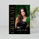 Make a stunning impression with this modern graduation party invitation featuring a bold single portrait photo alongside "Graduate" in gold foil running vertically on a sleek black background. The back displays a second photo with "Grad Party" event details in black script and serif typography on white. All text is fully customizable, including the graduate's name, class year, and event details.