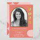 Les invitations à la fête de remise de diplômes de Modern Mod arches avec une photo du diplômé. Dispose d'une véritable feuille d'or (à l'avant). Changez la photo avec votre photo et elle la changera automatiquement en noir et blanc. Jolies couleurs de corail et rose vif, mais vous pouvez changer les couleurs si nécessaire et n'importe quel texte !