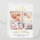 Un faire-part de naissance de bébé blanc moderne, simple et élégant avec 5 photo montage grille, et une élégante calligraphie typographique, avec bonjour nom bébé. Introduire bébé avec de la feuille d'or réelle.