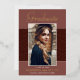 Une carte de faire-part de graduation photo unique, avec des éléments de design d'élégant script de style manuscrit. Le mot "Graduate" et le nom des finissants dans le papier à feuilles réelles (les options de couleur de papier sont or, argent et rose). La photo des finissants est bordée d'une bordure blanche et d'une garniture ondulée décorative. Le design est complété par un arrière - plan dans les tons de terre cuite. Le dos de la carte offre un espace de texte personnalisé pour ce diplômé spécial. Pour voir d'autres articles comme celui-ci, visitez mon magasin ici à "www.Zazzle.com/LakeViewCardCo". Merci