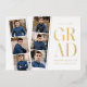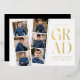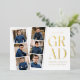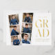 Invitations branchés de la fête de remise des diplômes avec une bande de film avec 6 photos carrés du diplômé. "Grad" est affiché en papier doré moderne avec un arrière - plan blanc. Personnalisez le devant de l'invitation de la fête de graduation multiphoto en ajoutant le nom du diplômé, le nom de l'école et l'année de graduation. L'invitation inverse pour afficher les détails de votre fête de remise de diplômes en lettres blanches avec un arrière - plan noir. L'invitation de la fête de fin d'études est parfait pour les diplômés du secondaire et du collège.