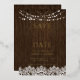 Moderne rustique enregistrer la date avec la texture faux bois de barnwood, et feuille de golf calligraphie manuscrite moderne, dans un design élégant, simple, avec des lumières scintillantes et dentelle. Copyright Anastasia Surridge Designs, tous droits réservés.