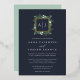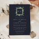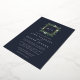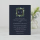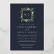 Notre faire-part de mariage en monogramme de serre présente vos initiales, monogramme ou duogramme en haut, niché dans une couronne carré de feuillage vert aquarelle, feuilles botaniques et de minuscules fleurs blanches sur un riche arrière - plan bleu marine avec garniture en feuille d'or. Un aperçu moderne de la tendance botanique pour les mariages d'hiver, les noces romantiques d'automne ou d'automne, ou les élégants mariages de soirée d'été.