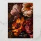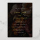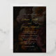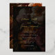 Une moody fine flore doré faire-part de mariage en feuille d'or avec un beau fond de flores sombres sous une couverture noire, un élégant mélange de police d'une police de script de calligraphie et une police serif pour les noms et les détails mariages. Le dos montre un bouquet de fleurs d'automne dans le style d'une peinture baroque à l'huile avec des couleurs chaudes d'automne d'automne.