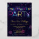invitation du parti sweet sixteen en violet foncé avec des lettres de néon brillant et des libellés de boukeh et de feuille d'or. Parfait pour un éclat dans l'occasion sombre.