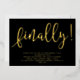 Une simple invitation typographique à une partie d'engagement. Ce design comporte le mot "enfin !" en gras feuille d'or, en caractères de police et détails de la fête en caractères sans serif modernes, le tout sur un arrière - plan noir.