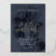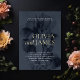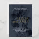 Élégant film sombre mariage invitation modèle avec botanique superposition d'oeuvre en bleu foncé, noms de couple pressé dans vrai feuille d'or. Les tons bleu foncé et noir donnent à cette papeterie mariage une sensation unique et sophistiquée. Il s'agit d'un modèle mariage entièrement personnalisable.