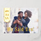 Mariage Sauvegarder la date de l'invitation Carte avec photo à fond et feuille d'or de luxe sur le devant. Le devant est écrit avec "We Said Yes!" dans la typographie rétro décalée avec un onglet or moderne pour loger votre date mariage. Le modèle photo affiche automatiquement votre photo au format paysage. Cette conception horizontale moderne a tout votre sauver le libellé de date sur le dos, fini avec vos signatures en écriture manuscrite.