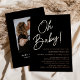 Invitations simples de douches bébé avec "Oh Baby !" affichées dans un script en papier or rose avec un arrière - plan noir. Personnalisez les invitations minimalistes de douches pour bébé avec le nom de la mère et les détails de la douche. Les invitations à la douche bébé en feuille d'or noir et rose s'inversent pour afficher votre photo de grossesse et le texte personnalisé. Les invitations sont parfaits pour des baby showers sans distinction de genre !