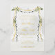 Un faire-part de mariage de chuppah à baldaquin d'olivier avec un chuppah blanc peint à l'aquarelle orné de branches d'olivier en vert et chatoyant vrai GOLD FOIL avec un paysage de forêt douce en arrière - plan, avec vos prénoms et demi-noms sur le devant dans le script GOLD FOIL. L'arrière comporte une couronne de branche d'olivier avec vos noms à l'intérieur. GOLD FOIL n'est qu'à l'avant de cet invitation.