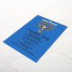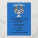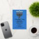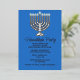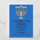 Invitation de papier de fête chic Hanoukka faite en bleu, avec les graphiques d'une menorah en feuille d'argent et le texte personnalisé en feuille d'argent. Personnalisez le texte personnalisé, sur le devant, pour répondre à vos besoins de fête.