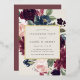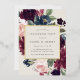 Notre invitation à la fête de fiançailles Plum Blossom encadre vos détails de fête avec une bordure carré élégante de feuillage d'aquarelle luxuriante et de fleurs en rose rousse, prune bordeaux violet et bleu poussiéreux, avec de véritables garnitures en feuille d'or sur un riche arrière - plan d'ivoire blanc.