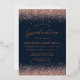 Cette invitation chic à la fête de graduation présente les bordures haut et bas de la parties scintillant d'or rose faux sur un arrière - plan bleu marine Le mot "Graduation" apparaît dans le script d'écriture manuscrite de feuille d'or rose réel. Customisez le rose feuille d'or sans serif texte avec le nom du diplômé et les détails du parti.
