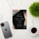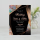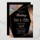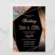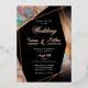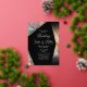 Un faire-part de mariage moderne avec un cadre géométrique élégant en feuille d'or rose chatoyante. Le thème principal est le noir avec des accents opales et faux parties scintillant. Une feuille d'or rose orne les détails principaux et le cadre géométrique avec le reste du texte blanc. Le script de calligraphie ajoute une touche de glamour et de luxe.