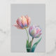 Cette oeuvre présente deux tulipes exquises aux teintes pastel douces, capturant magnifiquement leurs pétales délicats et leurs tiges gracieuses. Les fleurs sont restituées dans une palette rêveuse de rose pâle, de violet doux, de vert clair et de subtiles touches de bleu. La qualité translucide des pétales, associée au style réaliste mais peintre, crée un sentiment de beauté éthérée et de romantisme intemporel. Cette image florale ajouterait élégamment aux invitations de mariage, apportant à la fois sophistication et beauté tendre de la nature.