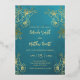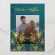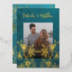 Cette élégante invitation au mariage présente une photo et des fleurs en feuille d'or sur un arrière - plan bleu poussiéreux à fleurs. Noms de mariée et de mariée dans un élégant script manuscrit.