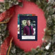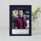 Élégante invitation de graduation bleu marine et argent personnalisée avec une photo sur la couverture et trois autres photo sur le dos. Invitation de graduation recto verso imprimée avec feuille d'argent contre un arrière - plan bleu marine avec la photo du diplômé dans un cadre argenté. 2 en 1 faire-part de graduation et invitation personnalisée avec des photos et le nom du diplômé sur feuille d'argent.