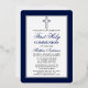 Elégante Marine Bleu et Argent Première Sainte Communion Invitation avec Croix. Cadre à huile d'argent. Croix de pétrole en argent. Arêtes arrondies. Refusé.
