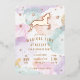 Une invitation à la fête d'anniversaire de licorne avec arrière - plan pastel arc-en-ciel peint en aquarelle. La licorne et les étoiles sont imprimées en feuille d'or véritable pour ce look pétillant !