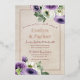 Cette invitation de mariage romantique et élégante présente un design floral vintage avec une véritable feuille d'or rose. Des bouquets de ranunculus violets et blancs sont placés dans des coins opposés. L'arrière - plan est un motif de parchemin défraîchi.